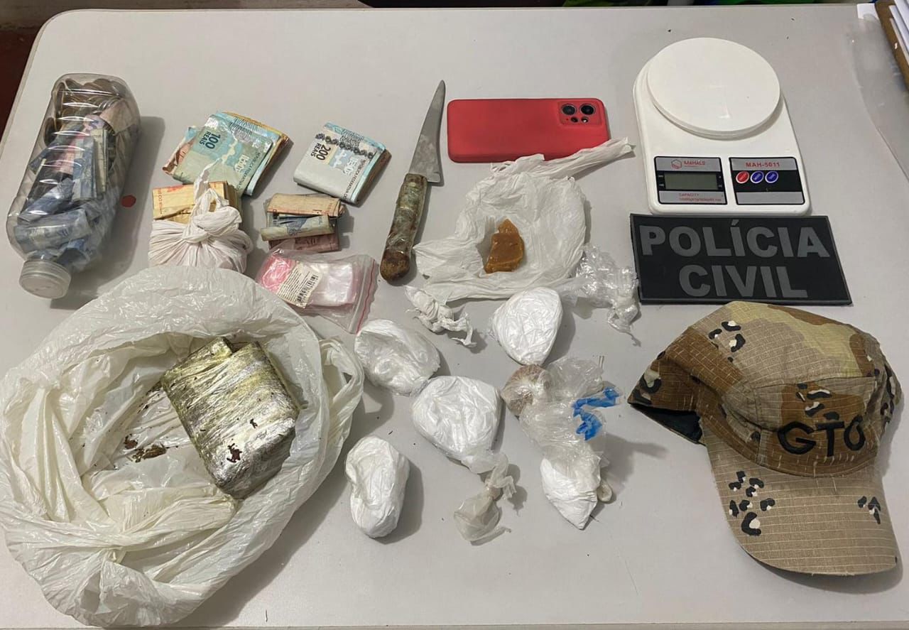 No local, foram apreendidos tabletes de maconha, pedras de “crack”, cerca de meio quilo de cocaína, apetrechos para acolhimento da droga, uma balança de precisão e mais de R$ 5.000,00 (cinco mil reais) em dinheiro.