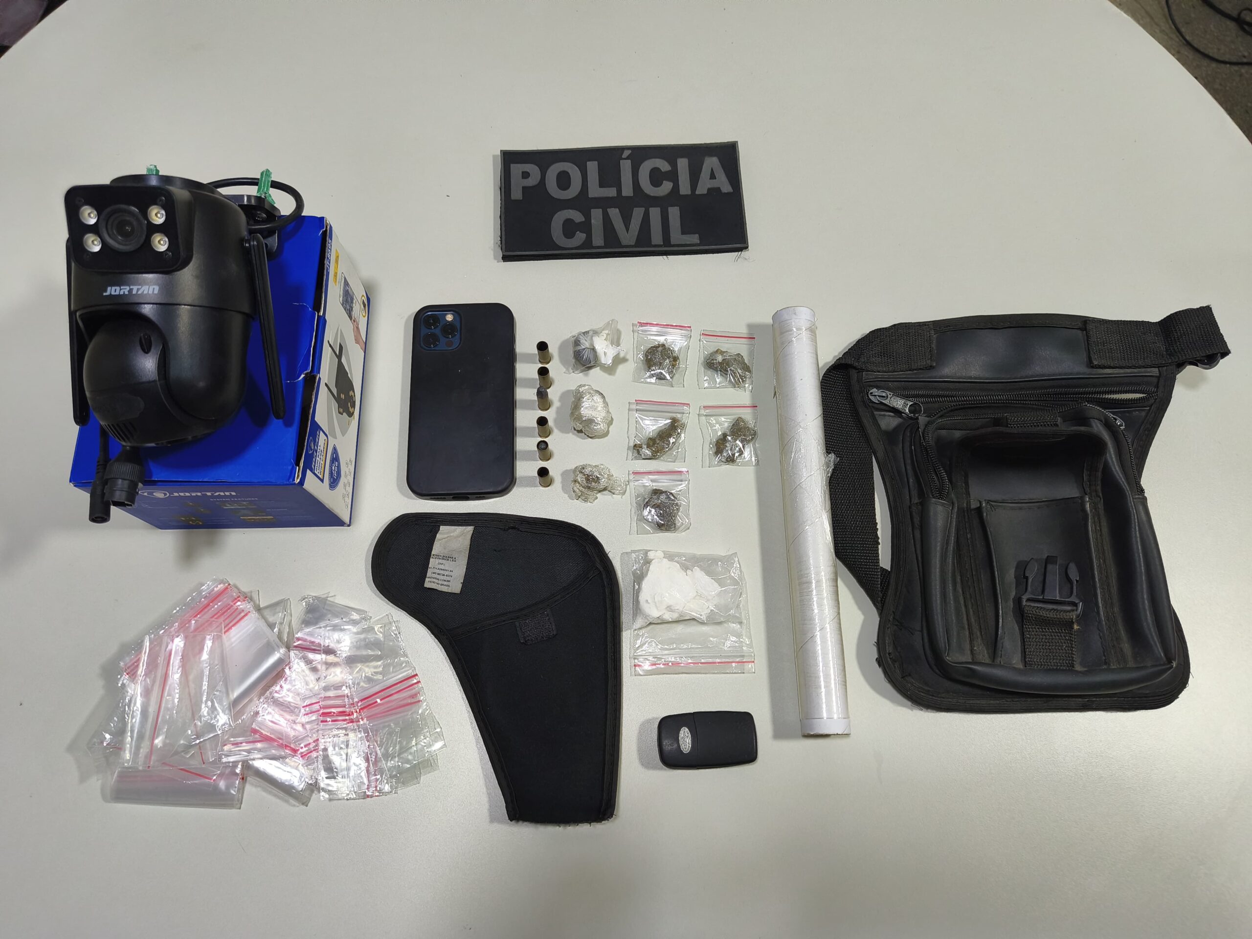 Com o suspeito, foram apreendidas drogas ilícitas como maconha e cocaína, além de apetrechos utilizados no preparo e comercialização dos entorpecentes. Também foram encontradas munições e outros materiais, indicando a atuação armada da organização criminosa na região.