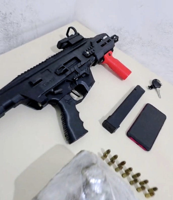Na revista veicular, foram localizados uma submetralhadora calibre 9mm produzida por impressão 3D, 14 munições do mesmo calibre, aproximadamente 700 gramas de substância análoga à maconha e um aparelho celular.