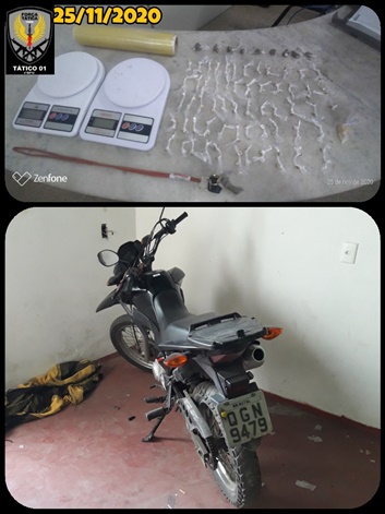 No local os policiais da FT4, encontraram uma motocicleta Honda Bros Preta QGN-9479, R$ 115 (Cento e quinze reais) porções pequenas e 03 (três) maiores de substância amarelada idêntica a crack , 09 (nove) porções de substância esverdeada semelhante a maconha, 02 (duas) balanças de precisão e embalagens plásticas utilizados para embalar drogas.