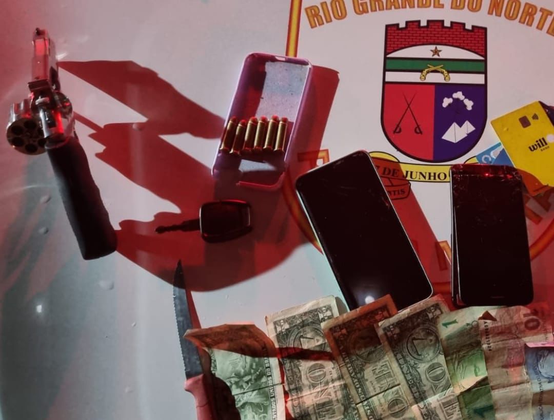 Durante a revista, os policiais encontraram diversos objetos roubados das vítimas, além de uma arma de fogo calibre .38 com seis munições. Os suspeitos foram algemados e conduzidos aos procedimentos cabíveis, tendo sido autuados em flagrante.