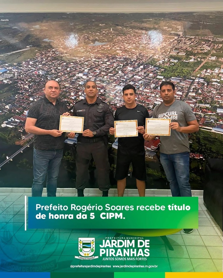 O Prefeito Rogério Soares, juntamente com o Presidente da Câmara de Vereadores, Emanoel Marina e o Chefe de Gabinete, Israel Donato receberam do Major Valdez, comandante da 5ª CIPM, nesta Terça Feira (29/11) o título de honra “amigo da quinta”, título dado a cidadãos que contribuem com o desenvolvimento do serviço da Polícia Militar da 5ª Companhia Independente da Polícia Militar.