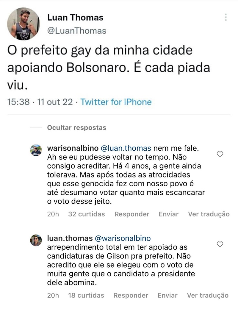 out 10, 2022, 8:22 pmAcho tão interessante esse povo tão sabido que é recriminar o prefeito por apoiar o presidente, ai vem outros idiotas que acha que apoiar o presidente é errado,meu povo,vcs procurem saber mais e estudar mais,como é que o país que democracia se não se pode ter liberdade de expressão.cada um vota no que acha melhor e pronto.