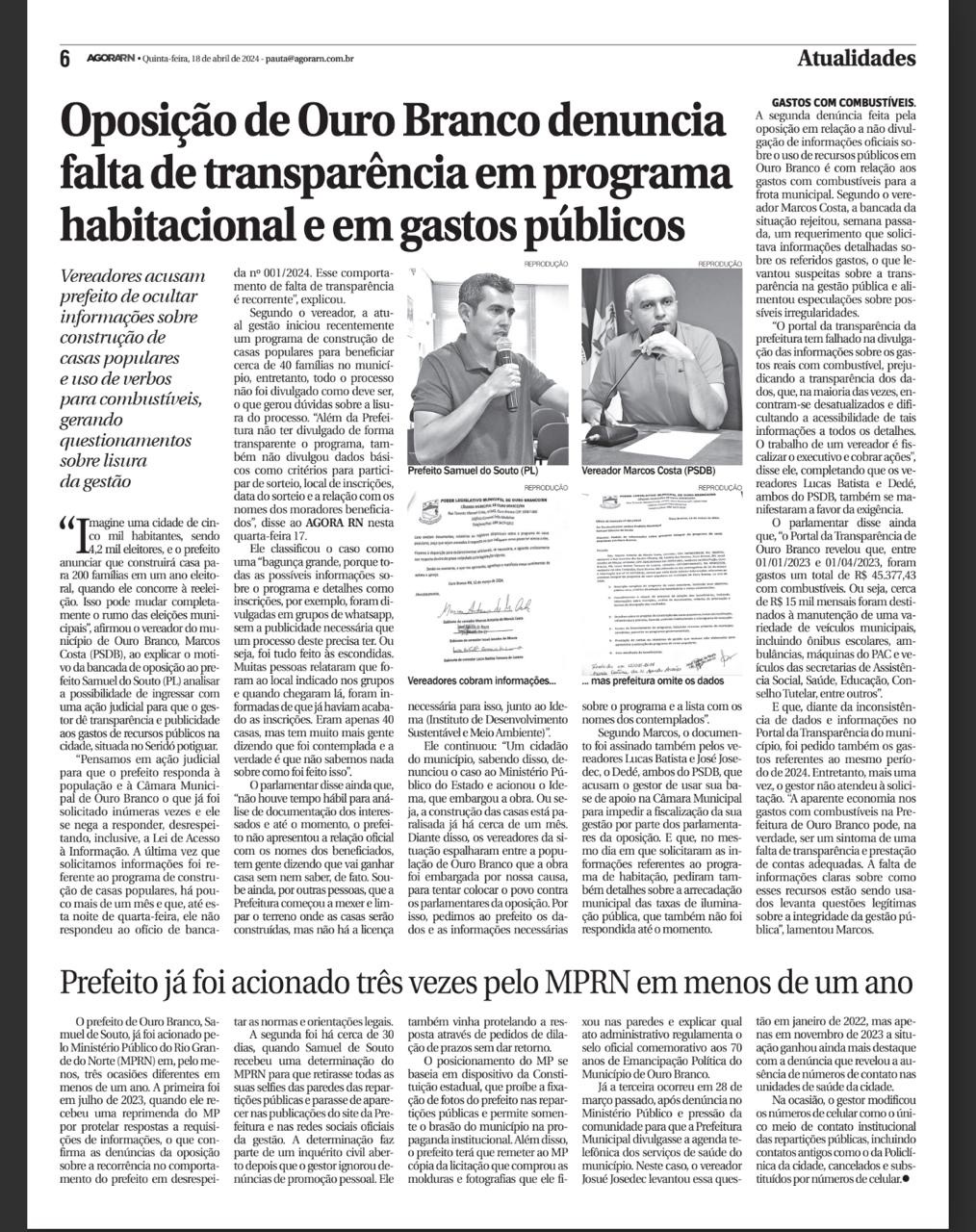 O jornal Agora RN traz reportagem mostrando que Samuel não respeita os mandatos da oposição. Se o trabalho de um vereador é fiscalizar o executivo e cobrar ações, como ninguém tem acesso as informações da Prefeitura? Segundo o vereador Marcos Costa, líder do PSDB na Casa, e um dos autores do requerimento, o portal da transparência da prefeitura de Ouro Branco tem falhado na divulgação das informações sobre os gastos reais com combustível, prejudicando a transparência dos dados.