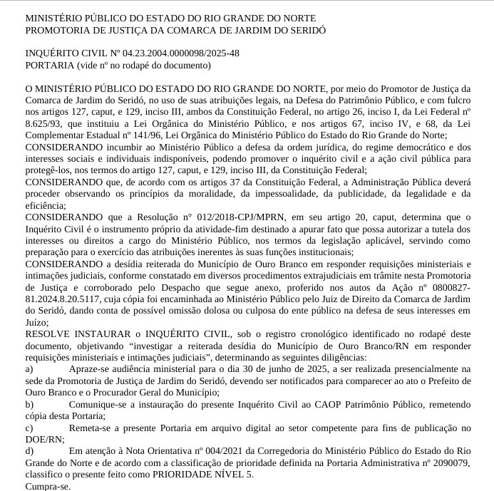 O Ministério Público do Estado do Rio Grande do Norte intimou o prefeito de Ouro Branco, Samuel de Souto, e o procurador jurídico do município, Carlos Derick, para comparecimento à sede da Promotoria de Justiça da Comarca de Jardim do Seridó no próximo dia 30 de junho de 2025. A audiência foi agendada no âmbito do Inquérito Civil nº 04.23.2004.0000098/2025-48, instaurado para apurar a reiterada desídia da gestão municipal em responder requisições do Ministério Público e intimações judiciais.