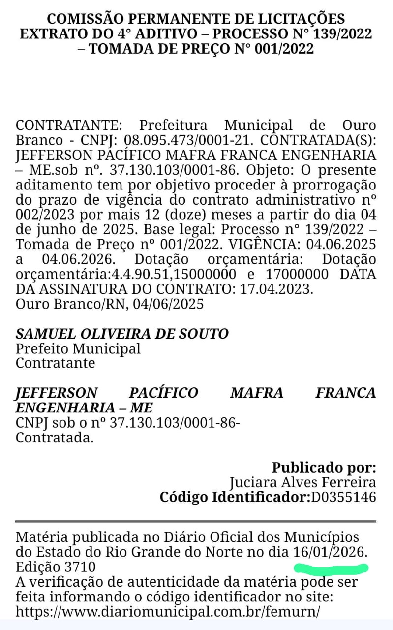 A Prefeitura Municipal de Ouro Branco (RN) publicou no Diário Oficial dos Municípios do Estado do Rio Grande do Norte, edição nº 3710, de 16 de janeiro de 2026, o extrato do 4º Termo Aditivo referente ao Processo nº 139/2022 – Tomada de Preço nº 001/2022, que trata da contratação da empresa Jefferson Pacífico Mafra Franca Engenharia – ME, inscrita no CNPJ nº 37.130.103/0001-86.