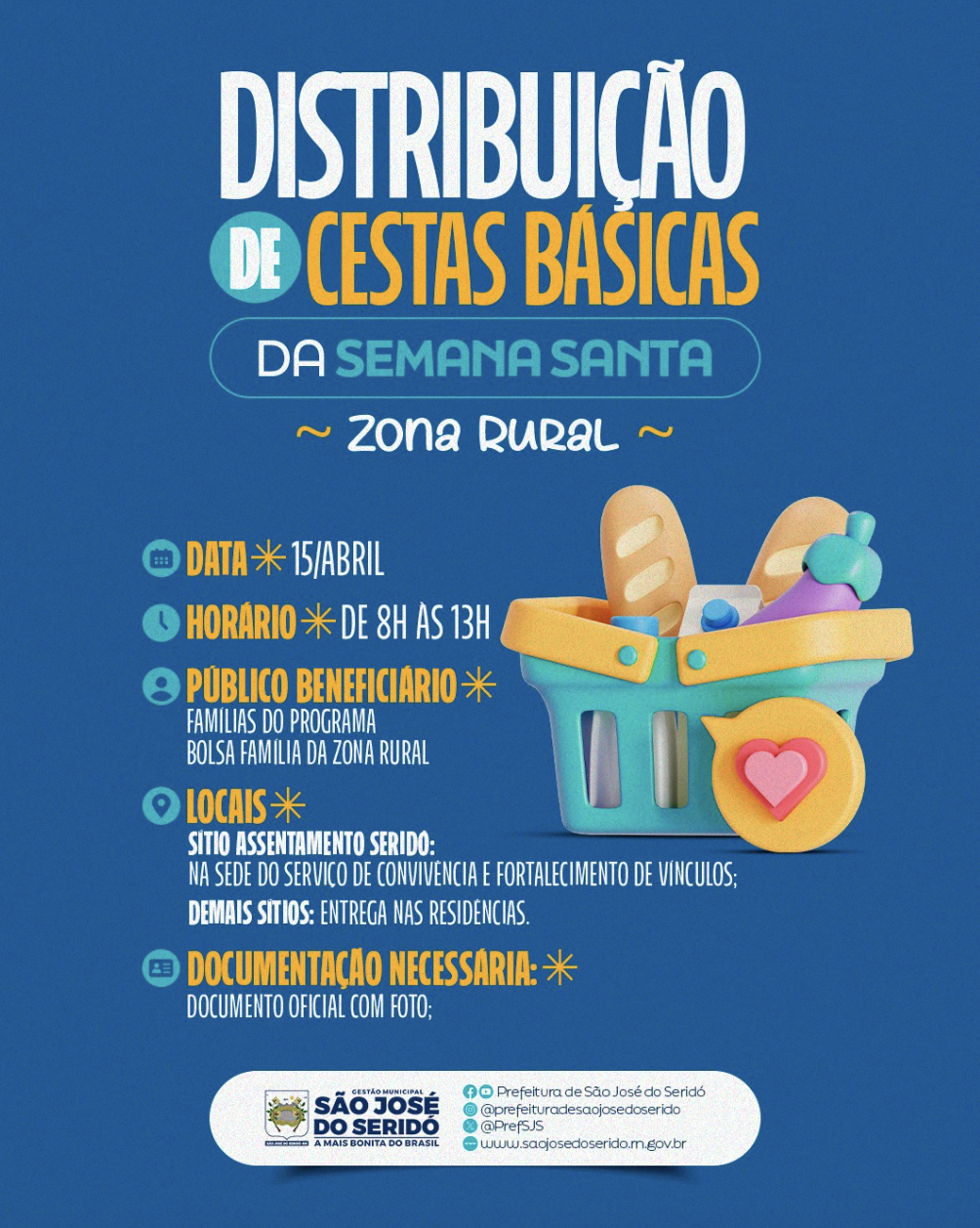 A prefeitura de São José do Seridó anunciou nesta terça-feira, 15, que fará distribuição de cestas básicas para a Semana Santa. As pessoas beneficiadas são famílias do Programa Bolsa Família da zona rural do município.
