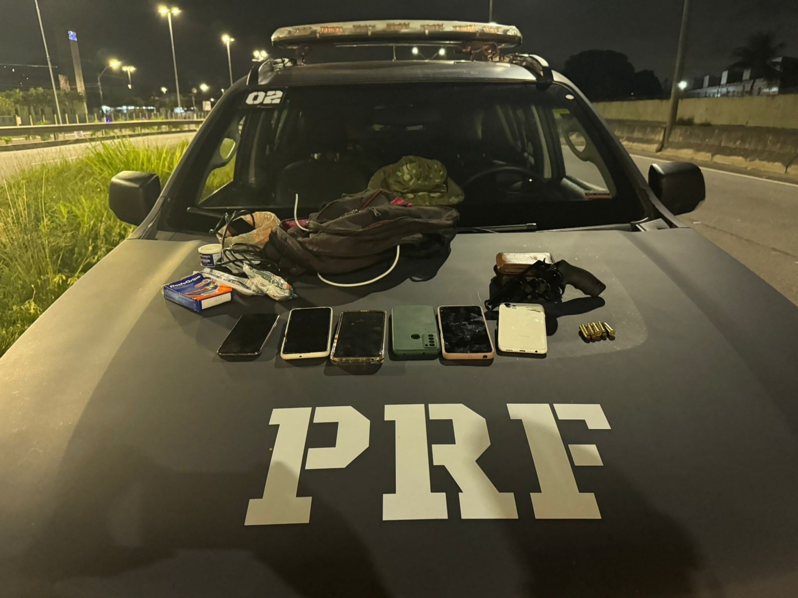Os suspeitos estavam em um veículo Chevrolet/Cobalt quando foram abordados pelos agentes. Durante a revista, a PRF encontrou um revólver, cinco munições e um celular registrado como produto de roubo.