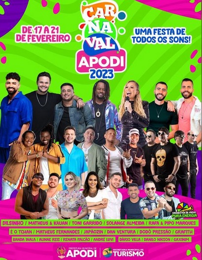A prefeitura de Apodi, no interior do Rio Grande do Norte, divulgou as atrações do carnaval 2023, e parece não ter poupado esforços para contratar atrações baianas, do segmento sertanejo e também pagodeiro para atrair público e girar a economia da terceira da região nos festejos momescos.
