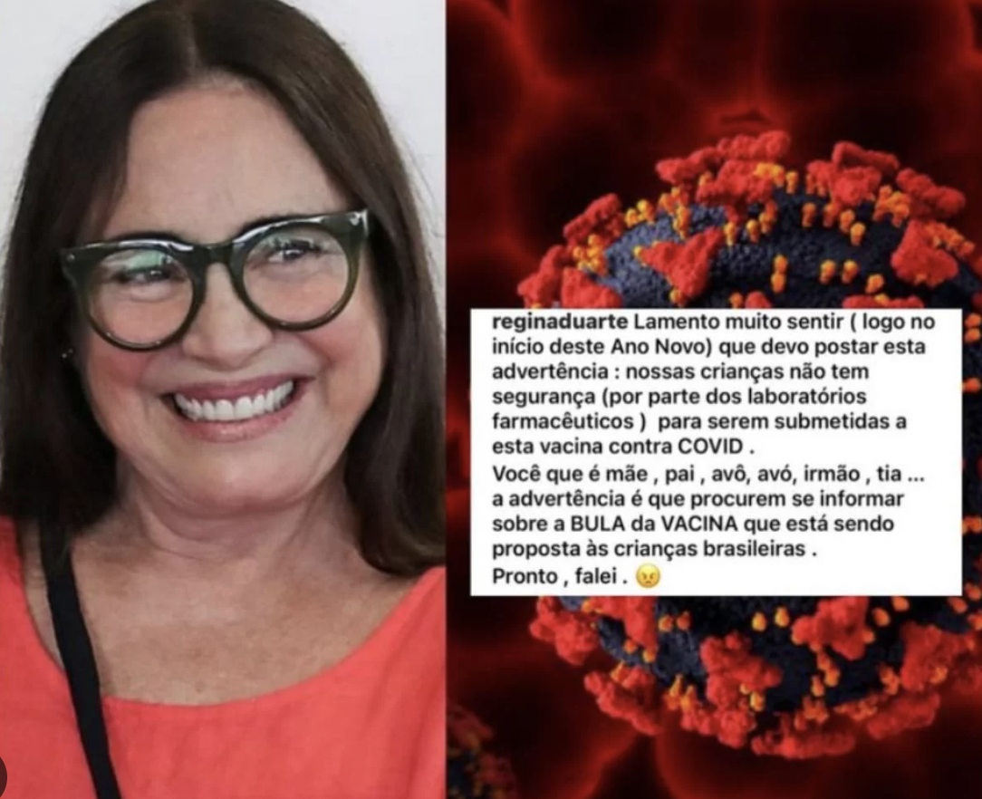 Regina seguiu alertando os internautas: “Você que é mãe, pai, avô, avó, tia… a advertência é que procurem se informar sobre a bula da vacina que está sendo proposta às crianças brasileiras. Pronto, falei”.