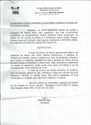 O deputado atendeu a solicitação do pré-candidato a prefeito de Macau e logo apresentou requerimento na Assembleia Legislativa pedindo que o Governo do Estado do Rio Grande do Norte reforme a Casa da Cultura de Maca, com a justificativa que a Casa da Cultura de Macau denominada Palácio dos Salineiros de Macau tem como objetivo transformar a realidade de milhares de crianças, jovens e adultos por meio de atividades voltadas à arte, cultura e cidadania, qualidade de vida e geração de renda, através de seus cursos e fomentar a cultura local.