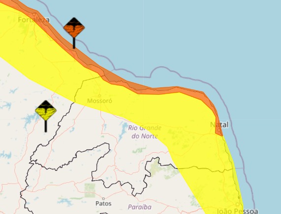 O alerta laranja abrange cidades de quase todo o litoral do RN, a partir de Parnamirim, e seguindo até Tibau, na divisa com o Ceará, onde o alerta também está em vigor. Ao todo são 21 cidades na classificação de perigo, com possibilidade de chuvas que variam de 30 a 60 milímetros por hora, 50 a 100 milímetros por dia, além de ventos intensos entre 60 e 100 km/h.