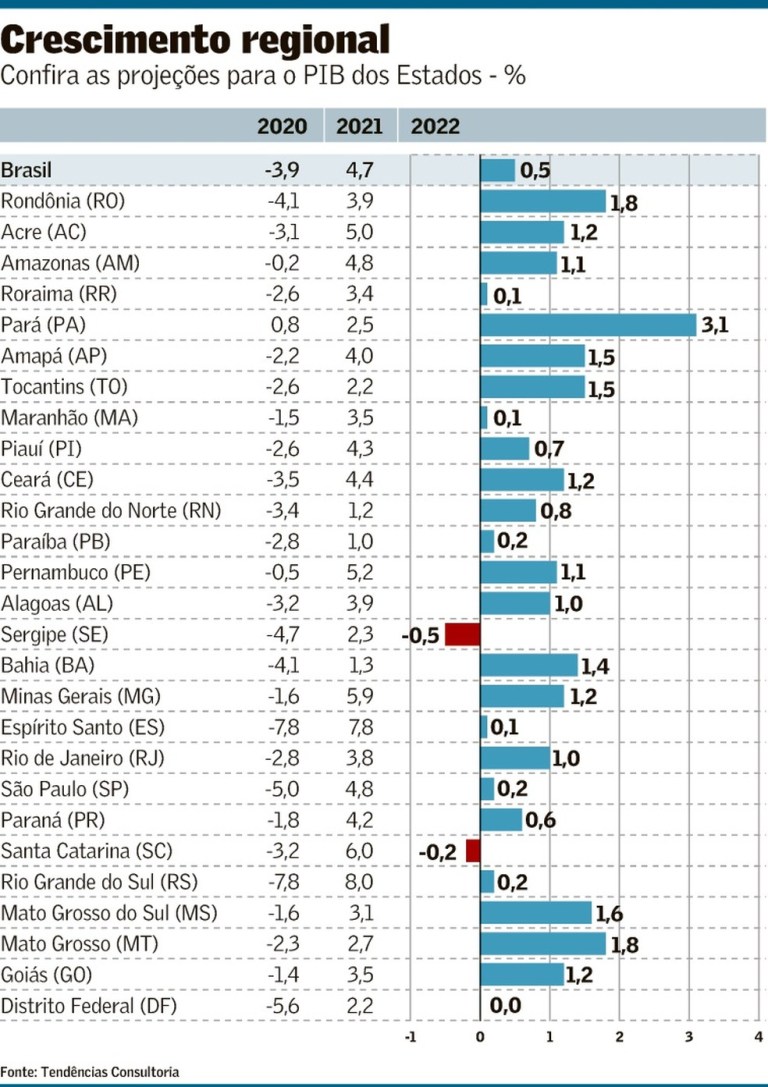 A projeção para 2022 é de um PIB ainda menor (0,8%), segundo a Tendências Consultoria. Dezoito das 27 unidades da federação devem ter crescimento do Produto Interno Bruto (PIB) superior ao do Brasil em 2022, segundo projeção da Tendências Consultoria.