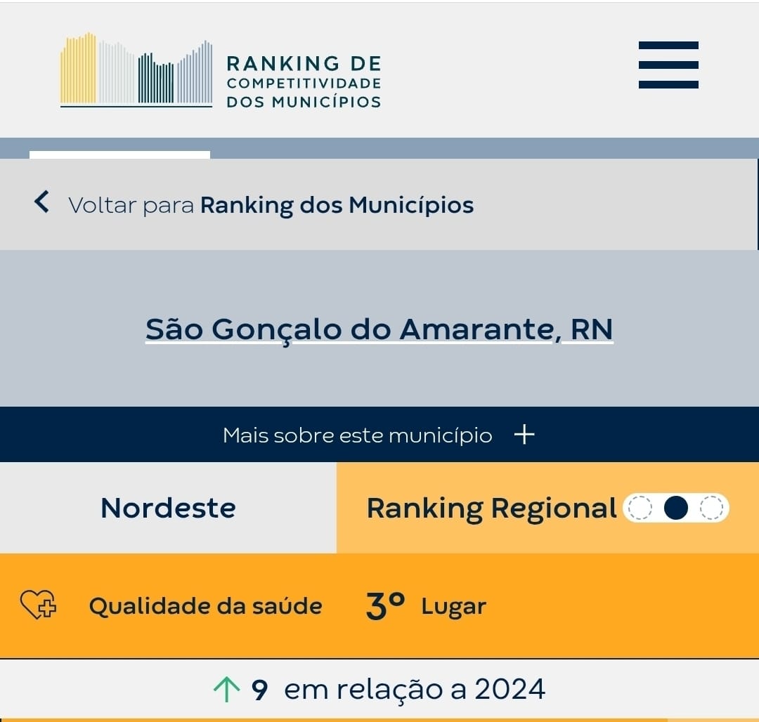 São Gonçalo do Amarante se destaca no Ranking de Competitividade dos Municípios 2025 com 3º lugar no Nordeste e 2º lugar no RN em Qualidade da Saúde