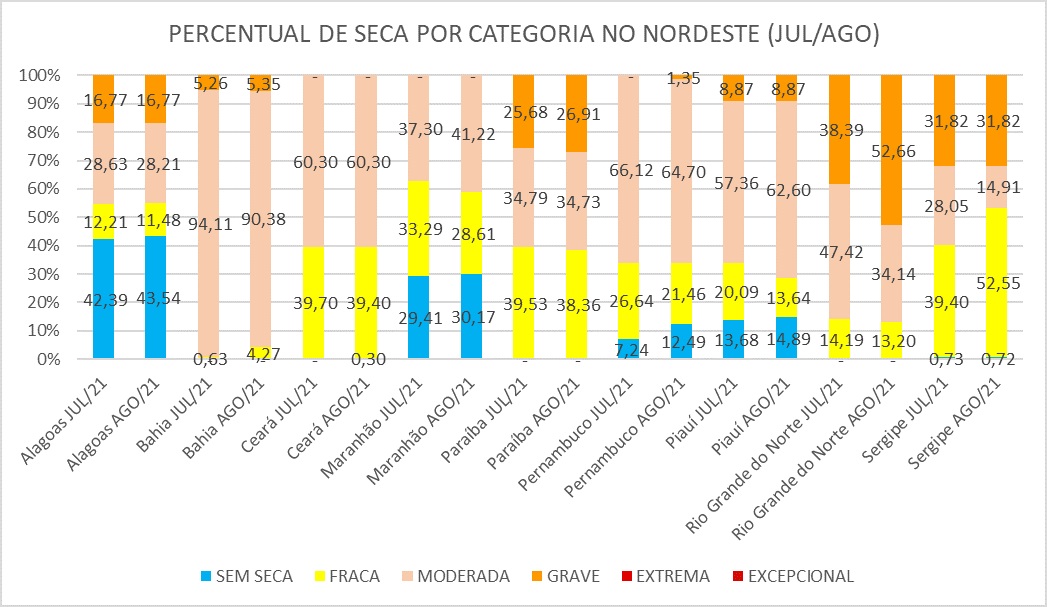 Os quatro estados que têm áreas sem seca são Alagoas (43,54%), Maranhão (30,17%), Piauí (14,89%) e Pernambuco (12,49%).