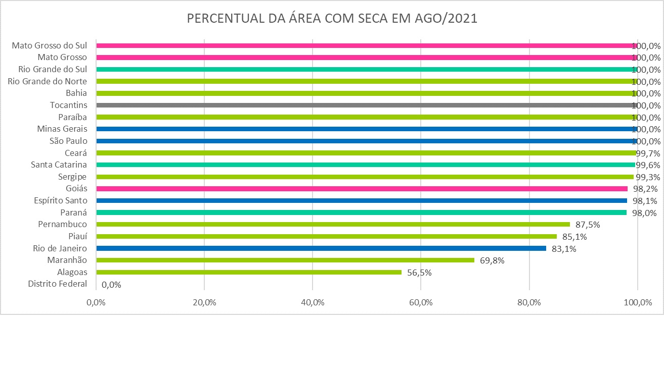Dos nove estados nordestinos, cinco estão com toda a área comprometida pela seca. Por severidade, o Sergipe (31,82%) vem depois do Rio Grande do Norte no referencial de área de seca considerada grave.