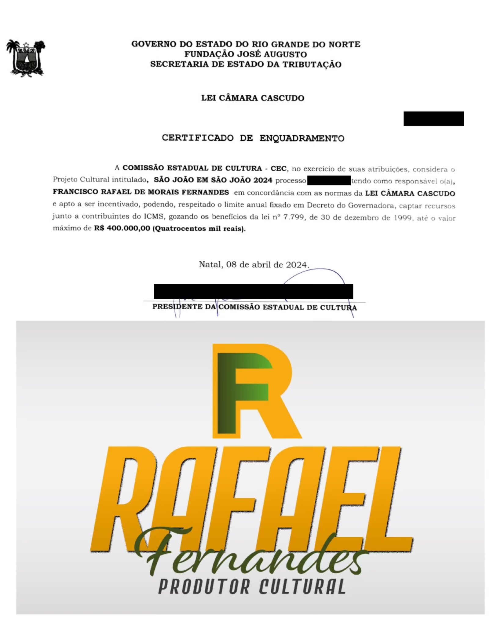 Rafael Fernandes foi contemplado com um certificado de enquadramento pela Lei Câmara Cascudo, permitindo a realização de um projeto cultural com incentivo de R$ 400 mil. É importante destacar que, como beneficiário, ele tem a obrigação de divulgar os patrocinadores e os responsáveis pela execução do projeto. - Distinção entre Funções: