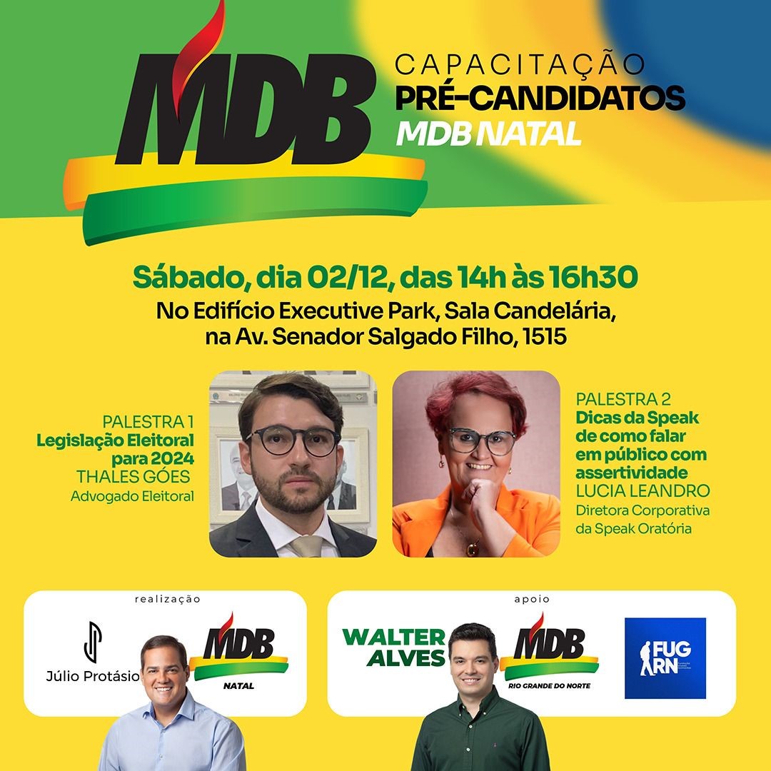 O MDB Natal vai promover, no sábado (02) na capital, o Seminário Eleitoral Capacitação Pré-Candidatos, com duas importantes palestras totalmente gratuitas e abertas para qualquer partido. O evento trará na programação dois importantes temas: O primeiro será “Legislação Eleitoral para 2024”, tendo como palestrante o advogado eleitoral, Thales Góes.