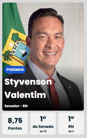 Styvenson Valentim é o melhor Styvenson Valentim senador do Brasil, de acordo com o Ranking dos Políticos, uma iniciativa da sociedade civil que avalia o desempenho de senadores e deputados federais com base em critérios como combate a privilégios, desperdícios e corrupção.