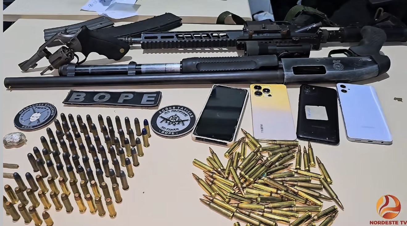 Além do fuzil, também foram apreendidos uma arma calibre 12, um revólver, um aparelho celular e diversas munições. O suspeito baleado foi encaminhado para uma unidade hospitalar. Os demais suspeitos foram presos e levados à delegacia, onde ficaram à disposição da Justiça para os procedimentos legais cabíveis.