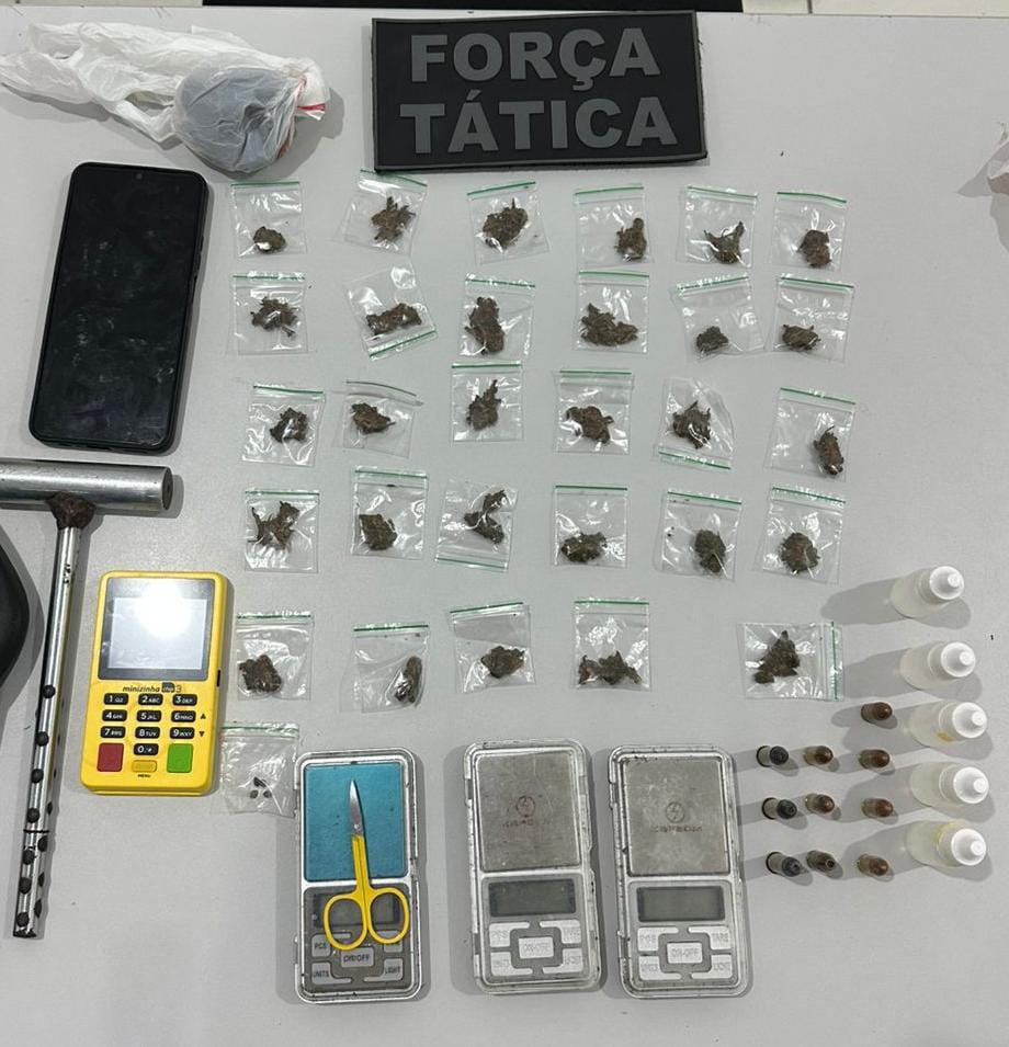Diante da atitude, foi realizada a abordagem policial, sendo encontrada com o suspeito uma bolsa contendo quantidade significativa de substância análoga à maconha já fracionada, além de munições calibres .38 e 9mm e uma balança de precisão, material comumente associado ao comércio ilegal de entorpecentes.