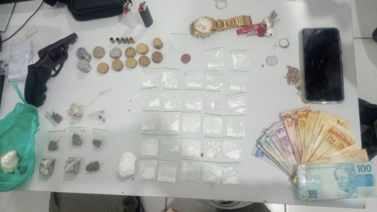 Com o suspeito, que não foi identificado no local, foram apreendidos um revólver calibre .32, cinco munições do mesmo calibre (sendo três intactas/picotadas e duas deflagradas), 28 porções de substância análoga à cocaína, nove porções de substância análoga à maconha, três pedras de substância análoga ao crack, além da quantia de R$ 536,15 em espécie e um aparelho celular.
