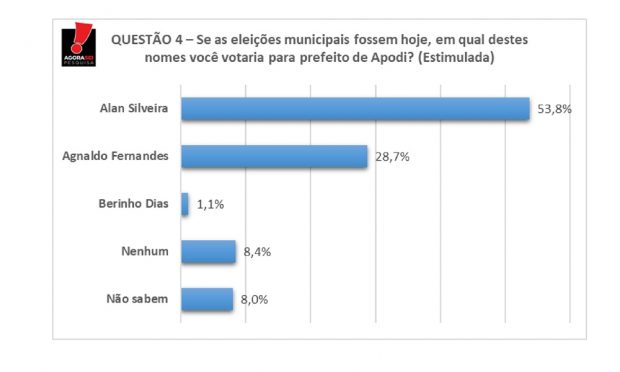 O prefeito de Apodi Alan Silveira(MDB) seria vitorioso com folga caso as eleições fossem realizadas hoje. A revelação vem através de pesquisa realizada pelo instituto AgoraSei em parceria com o portal Gazeta do Oeste, onde o prefeito Alan Silveira aparece com 53,8 pontos percentuais.