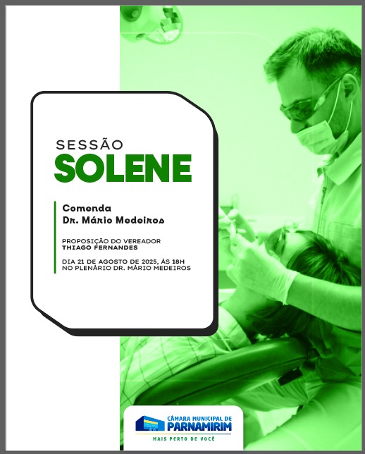 O que: Sessão Solene Comenda Dr. Mário Medeiros Quando: Quinta-feira, 21/08/2025, às 16h Onde: Plenário Dr. Mário Medeiros – Câmara Municipal de Parnamirim Como: Evento aberto ao público, com entrada gratuita Propositor: Proposição do vereador Thiago Fernandes