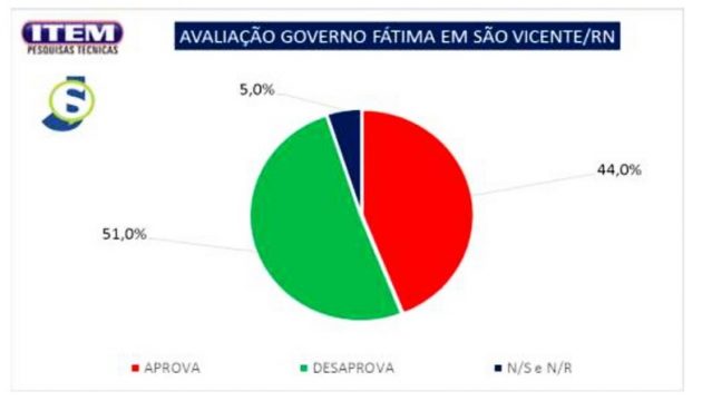 A pesquisa está registrada com o número TRE/RN: 07643/RN e ouviu 186 pessoas na Zona Urbana (o que representa 62,0%) e mais 114 pessoas na Zona rural (o que representa 38,0%). O nível de confiabilidade é de 95% e a margem de erro é de ± 5,5%. 51.0%DESAPROVAM A GESTÃO FÁTIMA: