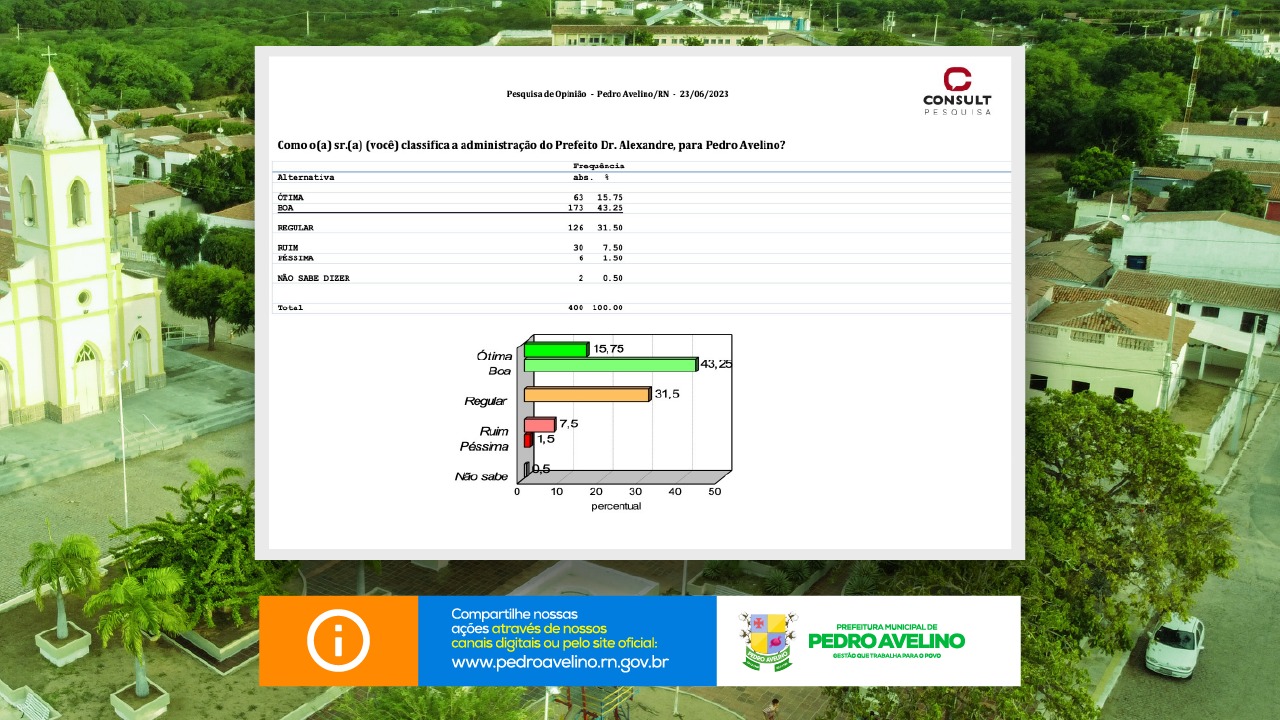O Instituto Consult realizou pesquisa de avaliação administrativa no município de Pedro Avelino, no Sertão Central Cabugi, e constatou que a atual gestão, do prefeito Alexandre Sobrinho (MDB), é hoje uma das mais bem avaliadas no estado. Com 15,75% de ótimo e 43,25% de bom, quando somados aos 31,5% de regular, a classificação da administração atinge incríveis 90,5% de aprovação.