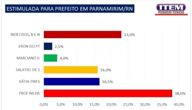 A pesquisa Seta também quis saber dos entrevistados em quem não votariam para prefeito de Parnamirim. Salatiel de Souza figura como o mais rejeitado com 16,7%, seguido por Eron do PT com 7%, Professora Nilda com 6%, Kátia Pires com 3,4% e Marciano Júnior com 2,7%. Não sabe/não respondeu aparece com 15,7% e ninguém/branco/nulo com 48,4%