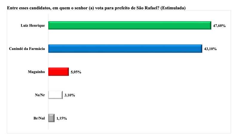 No quesito estimulado, quando o entrevistador diz o nome dos candidatos ao eleitor, o prefeito de São Rafael seria Luiz Henrique, com 47,60%, se as eleições fossem hoje: