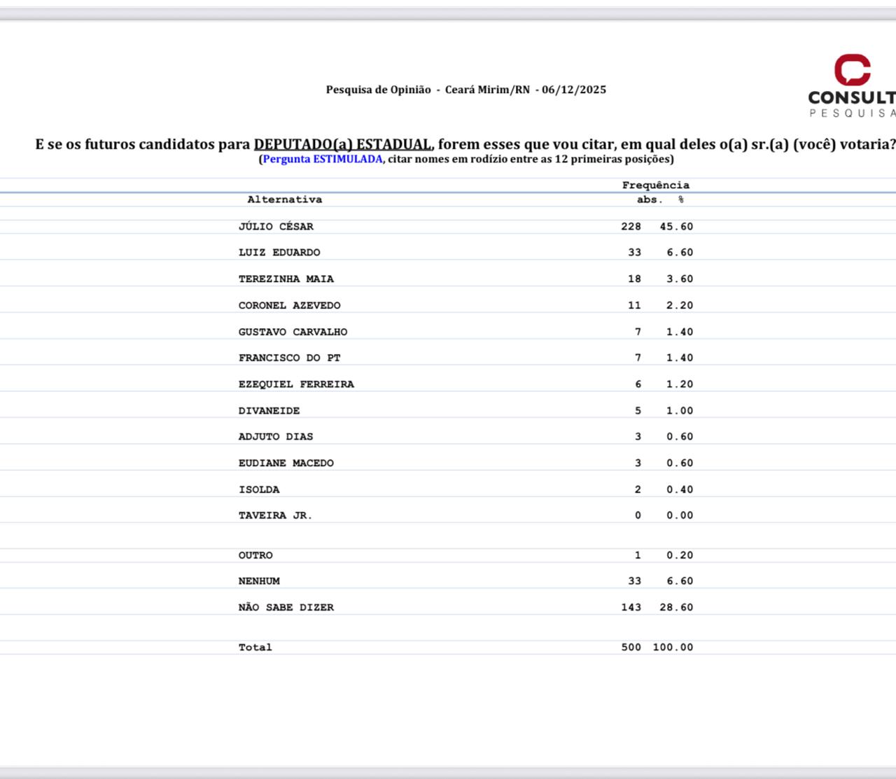 O levantamento TS2/TCM ouviu 1.870 eleitores, abrangendo todas as regiões e microrregiões do Rio Grande do Norte, entre os dias 9 e 13 de dezembro. A margem de erro é de 2,3 pontos percentuais, para mais ou para menos, com nível de confiança de 95%.