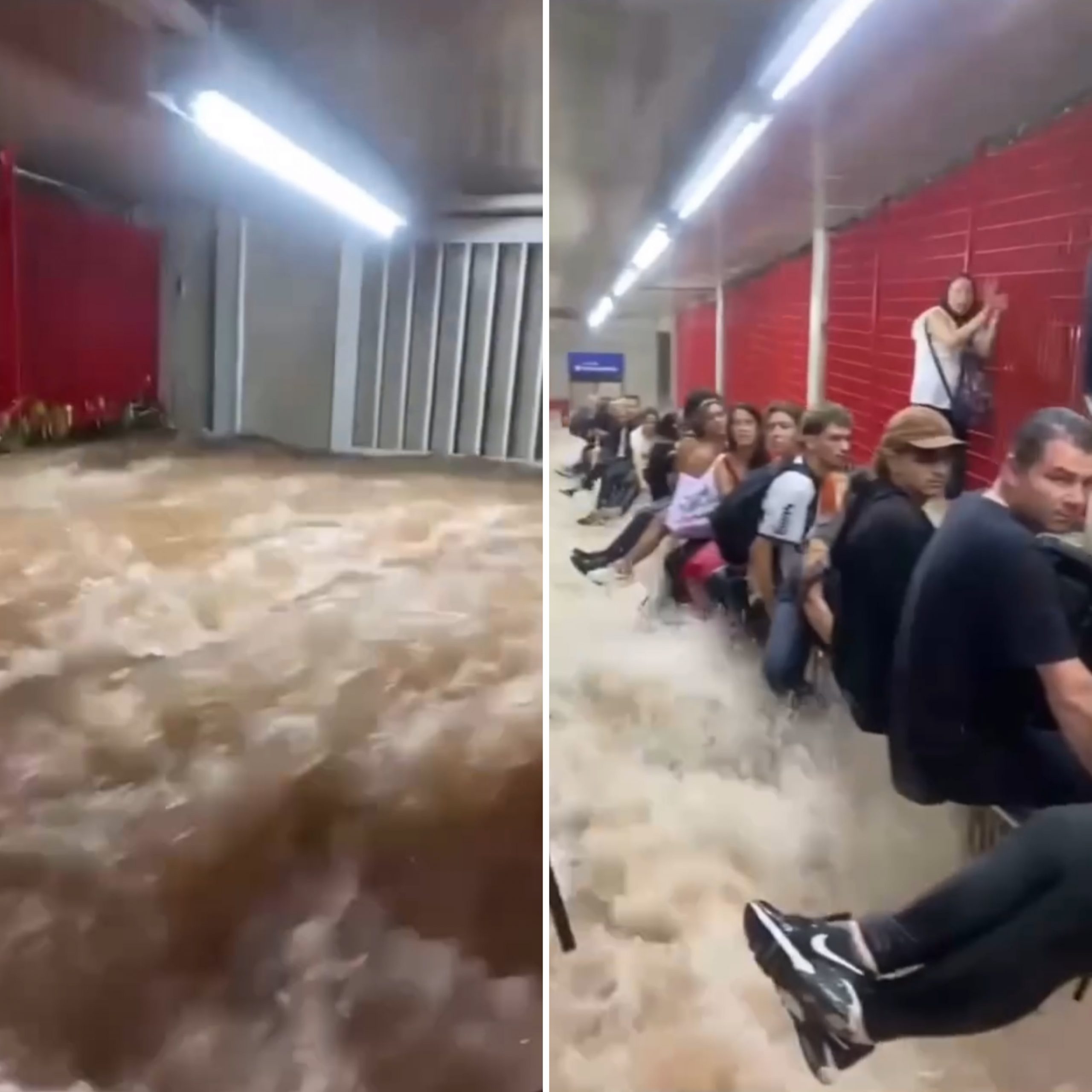 Vídeos que circulam nas redes sociais mostram que uma grande quantidade de água estava descendo da parte superior da estação até a plataforma. A escada rolante se transformou em uma verdadeira cachoeira.