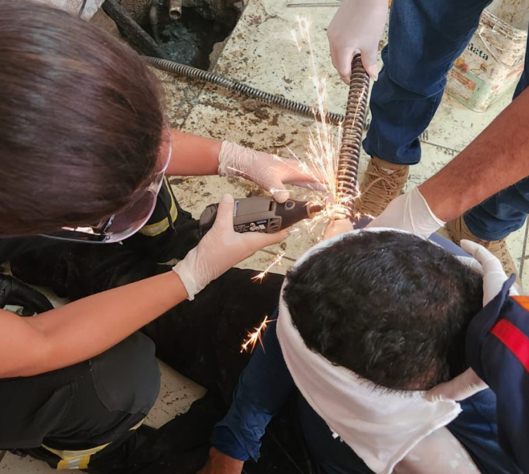Diante da situação, os militares utilizaram uma micro retífica da Unidade de Resgate (UR) para realizar o corte preciso do material, garantindo a liberação da vítima sem causar novos ferimentos.