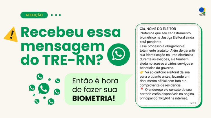 O Tribunal Regional Eleitoral do Rio Grande do Norte (TRE-RN) começou na segunda-feira (22) a encaminhar mensagens personalizadas via WhatsApp para os eleitores que ainda não realizaram a coleta de suas digitais. A previsão é que sejam enviadas cerca de 3.600 mensagens por dia, de segunda a sexta-feira, ao longo de dois meses.