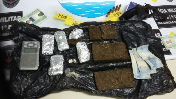 No local foi encontrado um revólver calibre .38, com cinco munições, sendo duas deflagradas, e uma mochila com aproximadamente 450 gramas de maconha, balança de precisão e dinheiro fracionado.