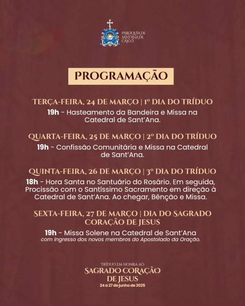 A Catedral de Sant’Ana deu início na terça-feira (24) ao Tríduo em honra ao Sagrado Coração de Jesus, um momento especial de celebração e devoção na Paróquia de Sant’Ana. O Padre Jerônimo Batista de Araújo, Pároco da Paróquia, convidou todos os fiéis a participar deste tempo de graça e devoção, que vai até o dia 27 de junho.