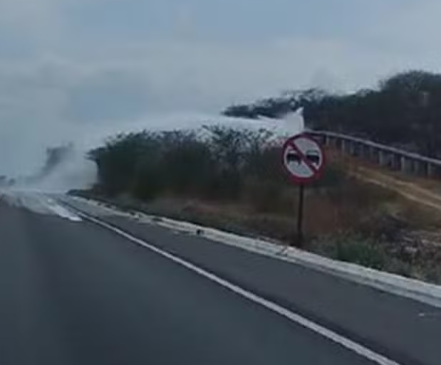 A tubulação de uma adutora de água estourou na manhã desta terça-feira (7) às margens da BR-304 perto de Angicos, na região Central potiguar. Com a pressão do sistema, a água jorrou para cima estrada, cobrindo carros que passavam pela região.