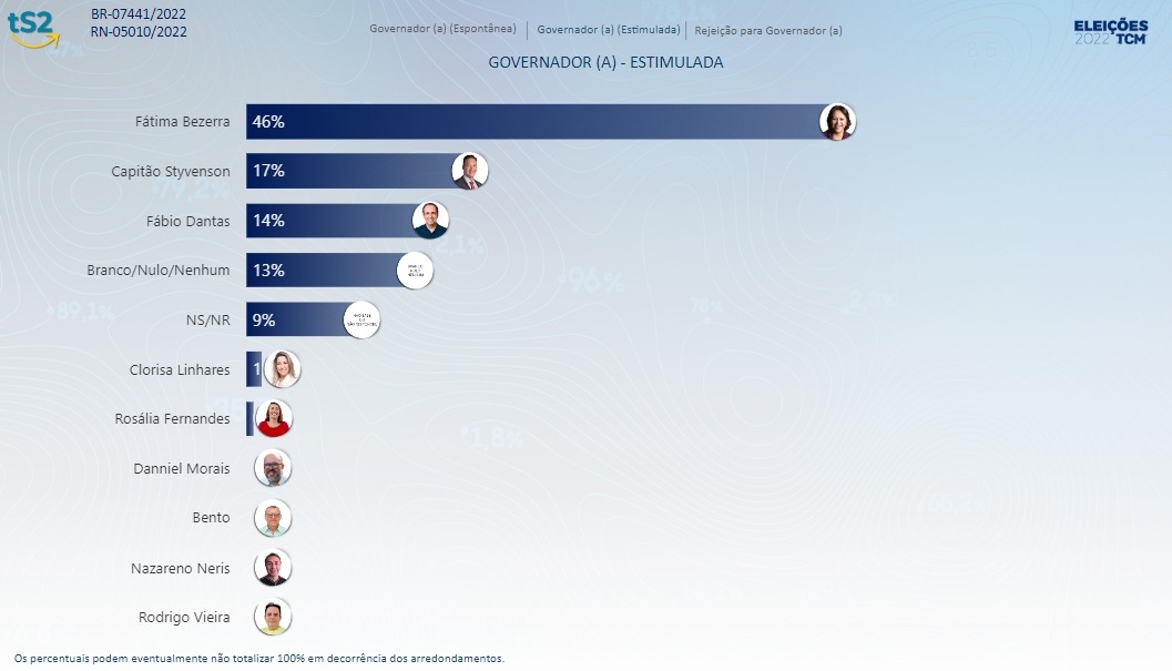A pesquisa TCM/TS2 perguntou aos eleitores potiguares em quem eles pretendem votar para ocupar o cargo de governador(a). A candidata à reeleição, Fátima Bezerra (PT) chegou aos 46% das intenções de voto. Segundo a pesquisa, se a eleição fosse hoje ela seria eleita no primeiro turno.