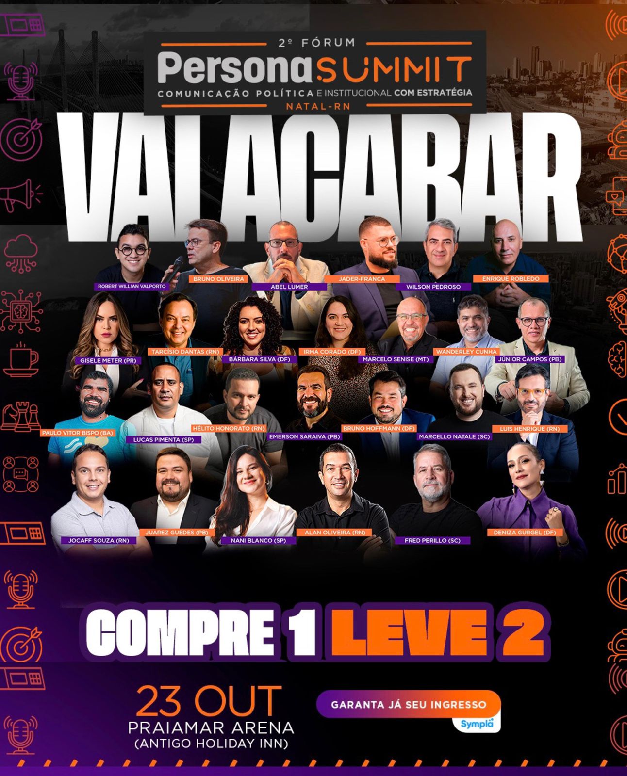 O 2º Fórum Persona Summit, maior encontro de marketing político e comunicação do Nordeste, está com uma promoção nos ingressos: na compra de 1 acesso, o participante ganha outro. A ação é válida até a próxima quarta-feira, dia 15 de outubro. A virada do terceiro lote também acontece na quarta-feira (15). O evento será realizado no dia 23 de outubro, no Praiamar Arena (antigo Holiday Inn Natal), reunindo grandes nomes da comunicação política, campanhas eleitorais e gestão pública em uma programação repleta de conteúdos estratégicos.