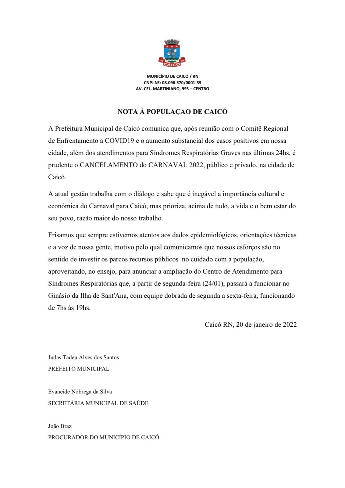A Prefeitura Municipal de Caicó comunica que, após reunião com o Comitê Regional de Enfrentamento a COVID19 e o aumento substancial dos casos positivos em nossa cidade, além dos atendimentos para Sindromes Respiratórias Graves nas últimas 24hs, é prudente o CANCELAMENTO do CARNAVAL 2022, público e privado, na cidade de Caicó.