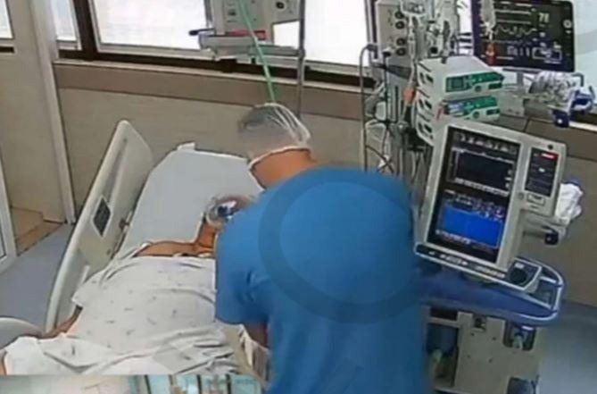 Nas imagens, Marcos aparece aplicando a substância e depois vê a equipe médica fazer manobras de ressuscitação.