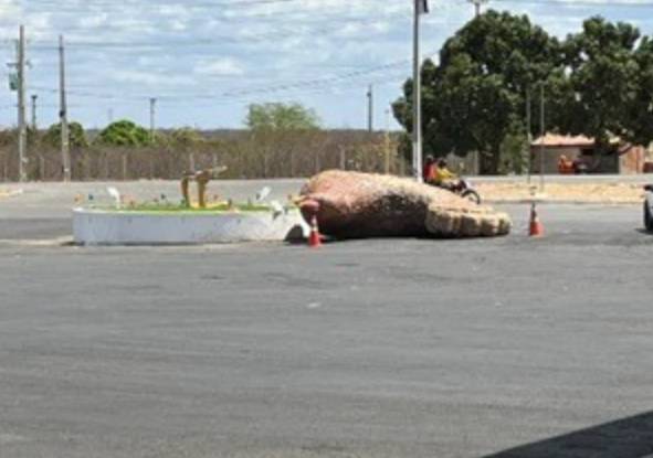 Uma ventania derrubou nesta quinta-feira (23) o monumento de uma galinha gigante, que se tornou símbolo da entrada da cidade de Assú, na Região Oeste do Rio Grande do Norte, nas margens da BR-304.