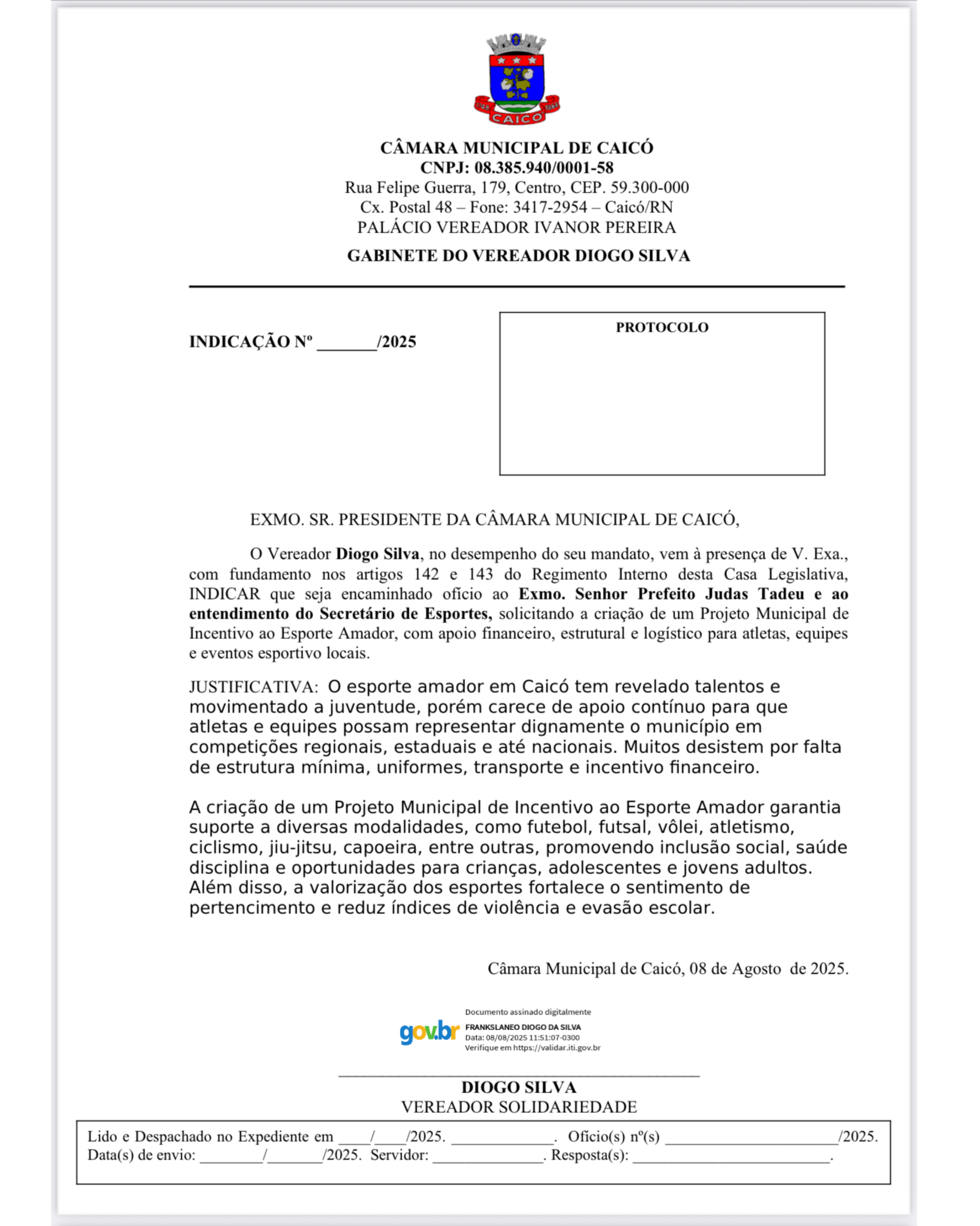 Durante sessão na Câmara Municipal de Caicó, o vereador Diogo Silva apresentou indicação solicitando que seja encaminhado ofício ao prefeito Judas Tadeu e ao secretário de Esportes para a criação de um Projeto Municipal de Incentivo ao Esporte Amador. A proposta prevê apoio financeiro, estrutural e logístico a atletas, equipes e eventos esportivos locais.