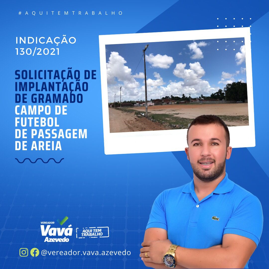 Por meio da Indicação Parlamentar n° 130/2021, apresentada em Plenário da Câmara Municipal, o Mandato do Vereador Vavá Azevedo (PP/Parnamirim) solicitou ao Poder Executivo Municipal a implantação de gramado no Campo de Futebol do Bairro de Passagem de Areia.