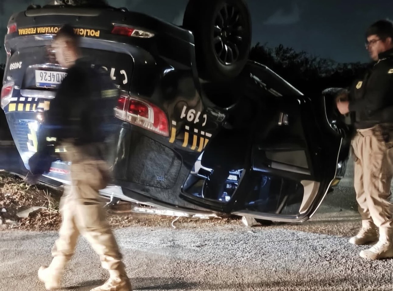 Viatura da PRF capota após perseguição a motociclista em fuga pela estrada do Moinho