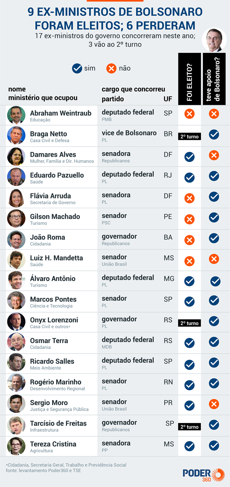 Entre os 17 ex-ministros do governo de Jair Bolsonaro (PL) que disputaram cargos públicos nas eleições, 9 foram eleitos nestas eleições.