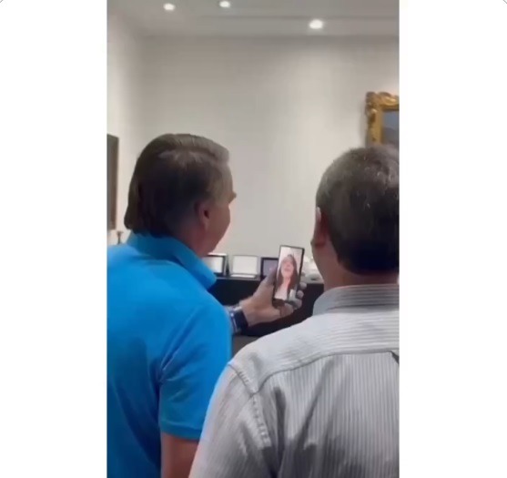 O presidente encerra a chamada de vídeo dizendo esperar manter contato sempre com a brasileira, que trabalha com vendas de armas nos EUA. “Que prazer maravilhoso, por favor mantenha contato”, completa Nayara.
