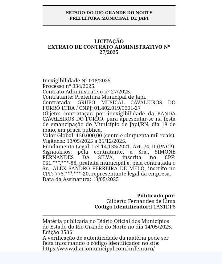 Na pacata cidade, Japi-RN, na região Agreste do Estado, os moradores especulam o que muitos críticos políticos já admitem: “o mandato da prefeita Simone (MDB) desandou de vez”. Primeiro vem um processo que a coloca no paredão, agora um contrato de inexigibilidade com um alto valor.